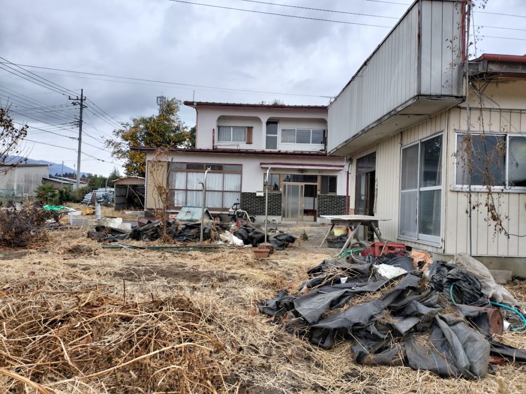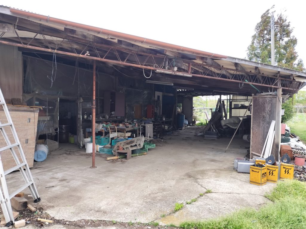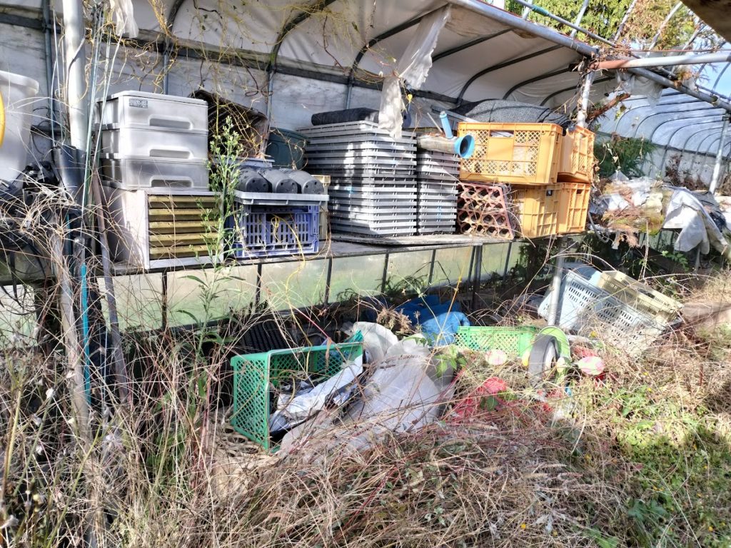 兄が使っていたビニールハウスの骨格が残っています。ビニールハウスの中で、農業をしていたので、農業資材の残置物もたくさんあります。農業資材は劣化してしまったので、廃棄していきます。