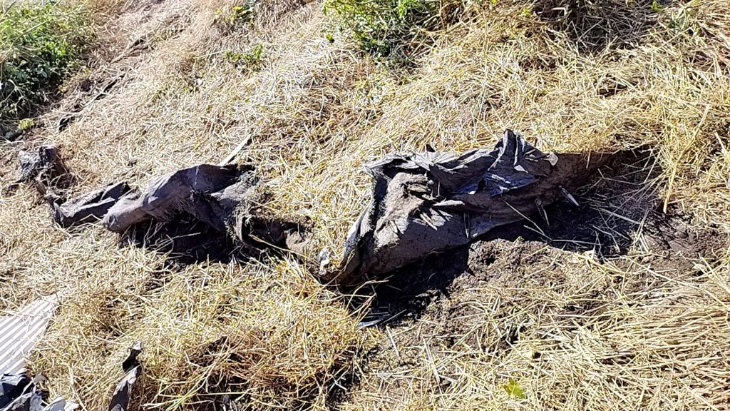 ハウスの中で作業していたようです。農業資材がそのままです。劣化が激しいので、廃棄していきます。
