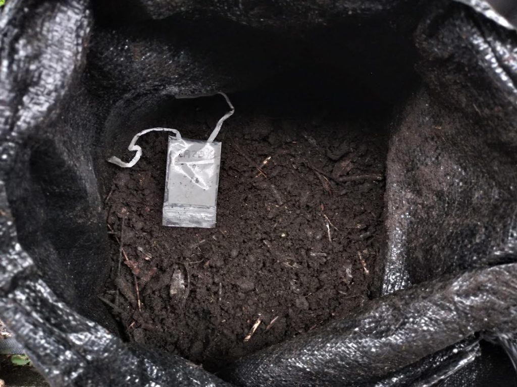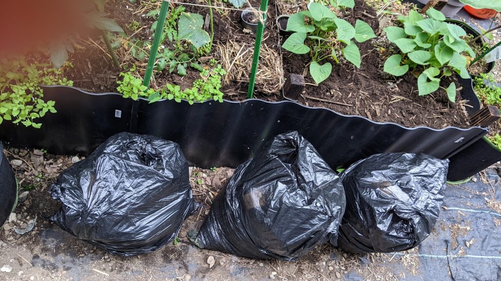 土嚢袋の中の培養土が雨に濡れないように、黒い袋を被せています。