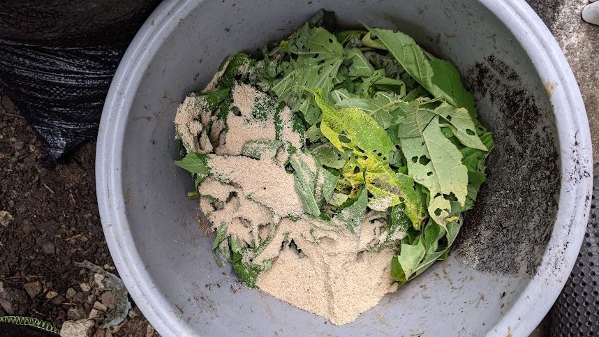 7月2日に、双葉の草と米ぬかをまぶして、土にミルフィーユ状に挟みました。