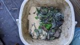 土嚢袋に、仕切りに黒土を入れた後に、コンポストの生ごみに米ぬか一つかみを混ぜて土嚢袋に入れました。