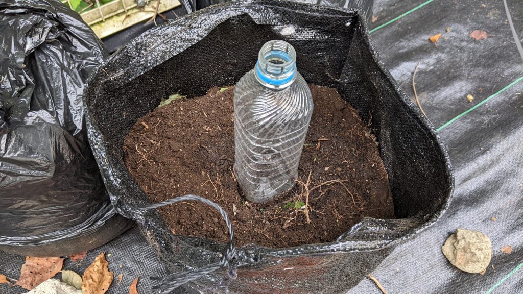 株もとに、底に四か所の穴を開けたペットボトルで水やりします。