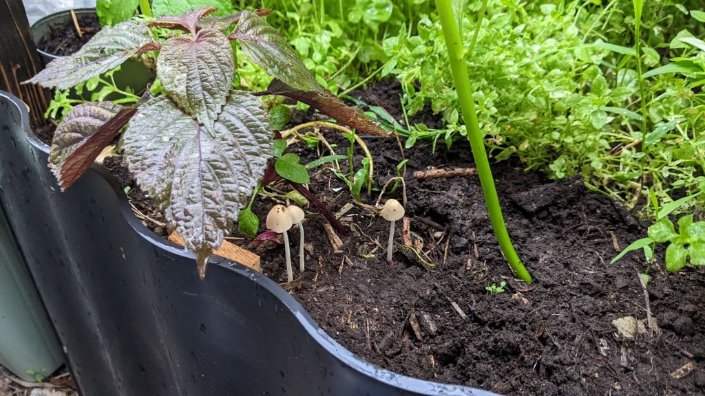 株もとにキノコが生えるのは、大歓迎です。キノコも糸状菌の一種ですから、糸状菌の育つ環境作りがうまくできたわけです。