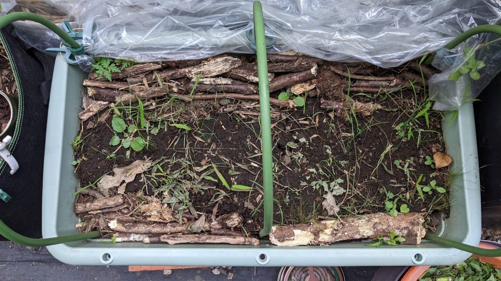 種から蒔いたので、発育が遅いとしても、もう少し元気になっていただきたい。発芽した苗は、枯れずに育っています。でも細いし小さいしで、ぜんぜんまだまだ。土がむき出しなのがいけないのかなと思うので、草マルチをして土壌菌を活性化します。