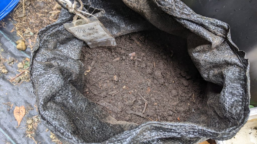 培養土を土嚢袋に戻しました。戻すときに、切り返してかき混ぜたものを戻します。