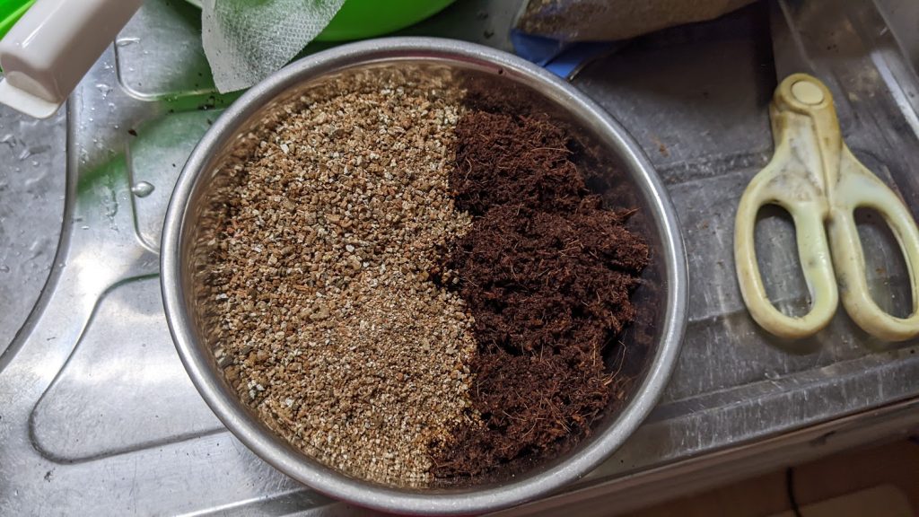 左がバーミキュライトです。混ぜて、栽培する培地にします。