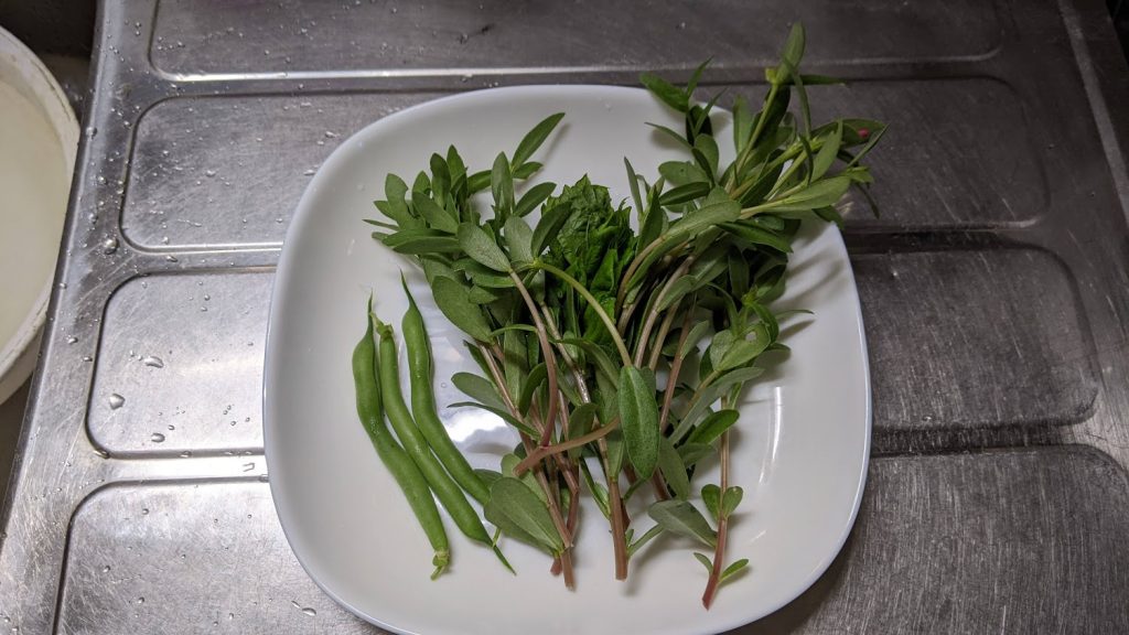 レイズドベッドから摘みました。インゲン豆とポーチュラカです。ポーチュラカは、スベリヒユ科です。食べられます。