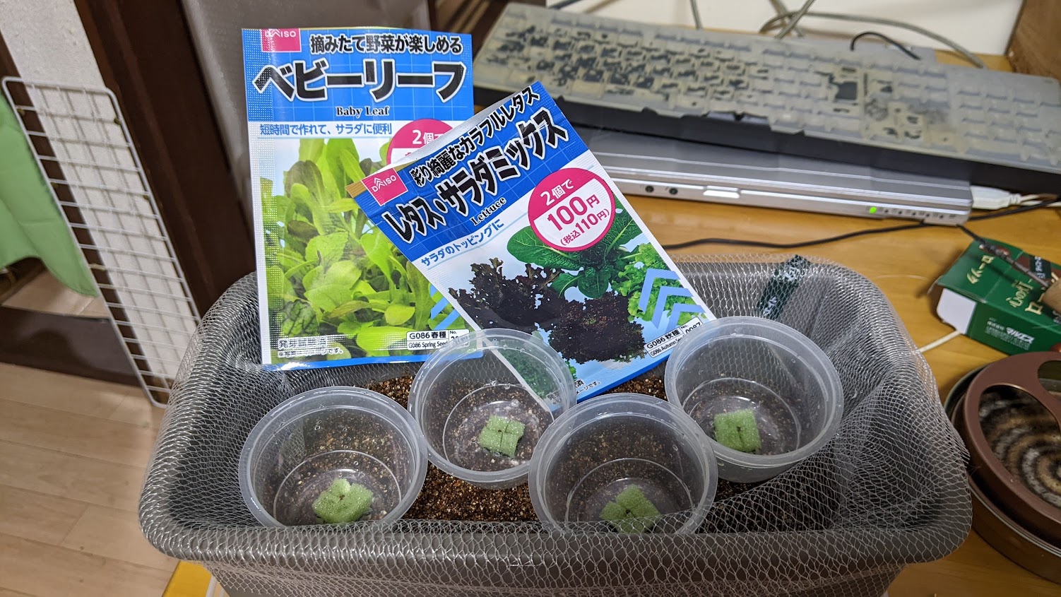カップの底の穴に合わせて切ったスポンジに、種を蒔きました。レタスがよかったのですが、種が春までの期限でした。心配なので、アブラナ科のベビーリーフも一緒に種まきをしました。