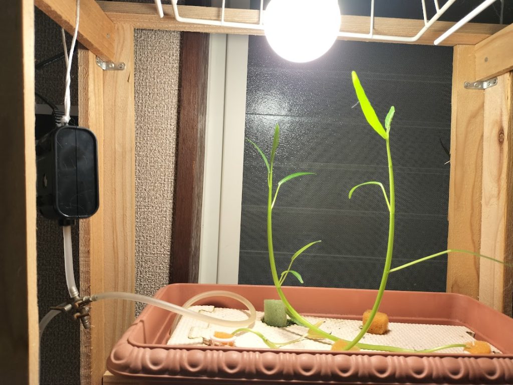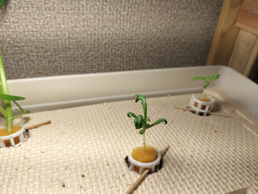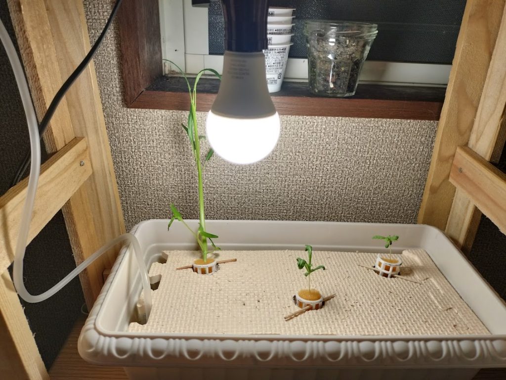 8月8日に種まきしたレタスとベビーサラダの葉野菜の種に根っこが出てきました。養液栽培(水耕栽培の一種)で育てています。