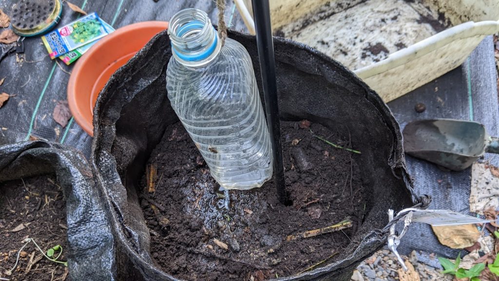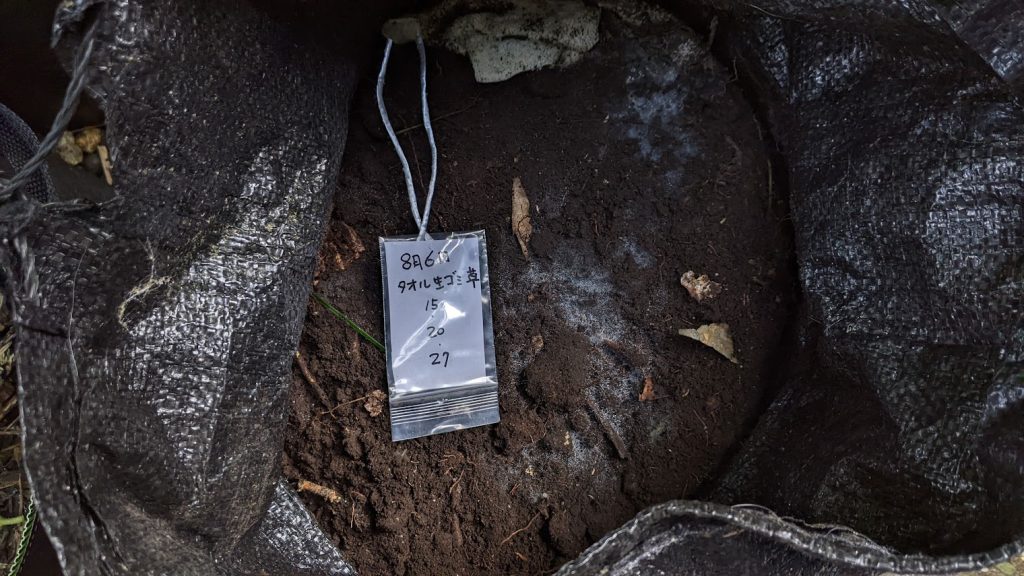 土と土の間にタオルを広げて、土嚢袋に詰めなおしました。次回の切り返しの時は、もう少し分解されているかもしれません。