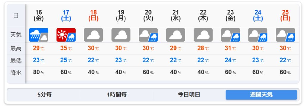 お盆を過ぎると、真夏の天候も少しずつ涼しくなると思っていたんだけれど、この週間予報じゃ、まだ暑いです。