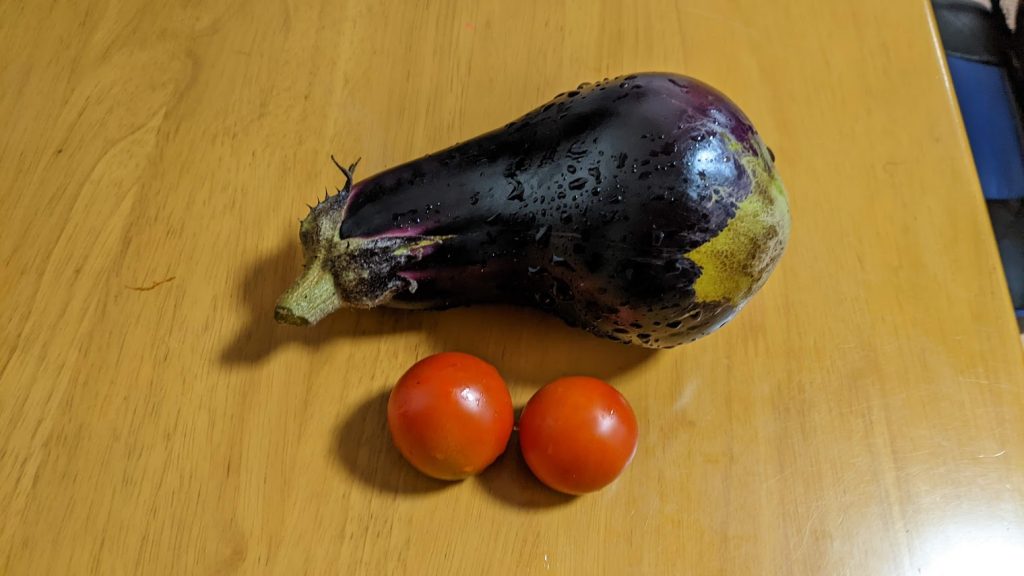 大きなナスが実りました。茄子の苗の商標が「とろとろステーキ茄子」です。