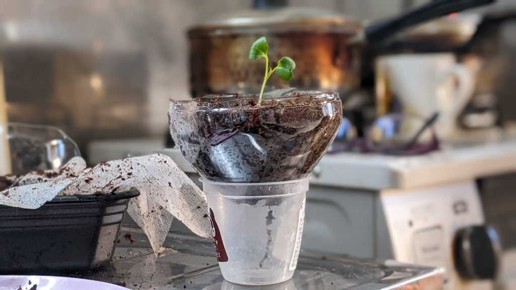 ペットボトルのカップ部分に、ココヤシピートで植えました。