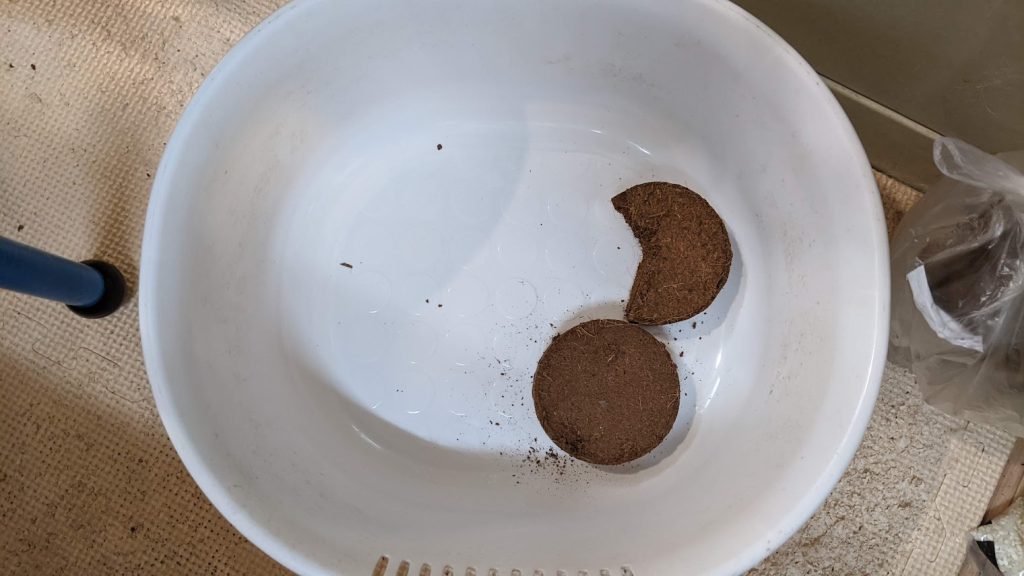 ダイソーで買ったココヤシピートです。小ブロックになっているので、使いたいだけ水に浸けます。