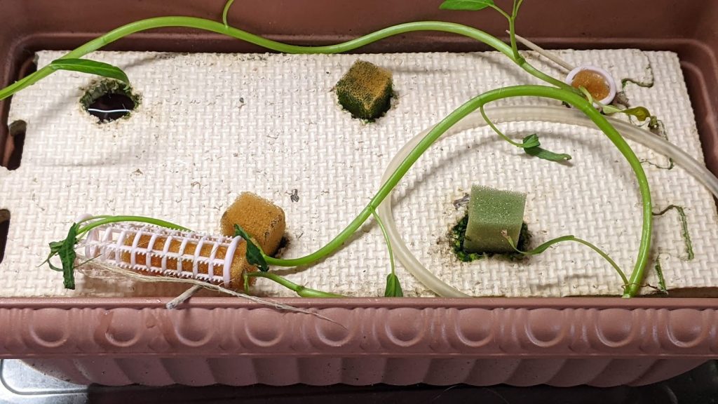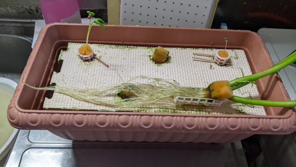 この写真は、養液栽培をしていた空心菜を移植したんですが、葉が茂ってこなかったので栽培終了しました。
