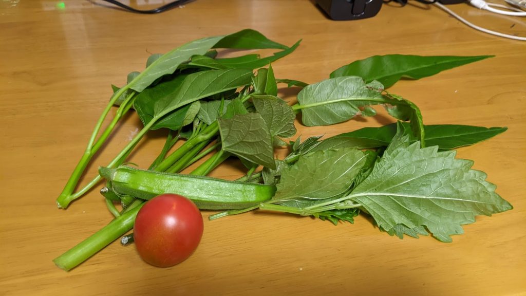 オクラが一つ、中玉トマトが一つ、空心菜にシソ、サツマイモの柔らかい穂先を摘みました。