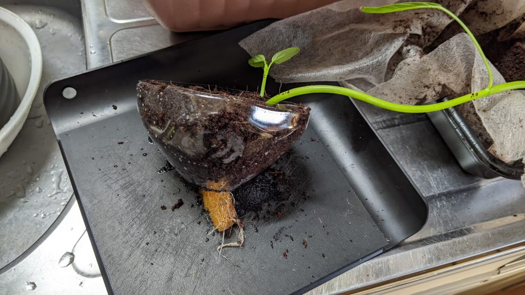 スポンジに根が絡んだ苗をそのまま植えました。