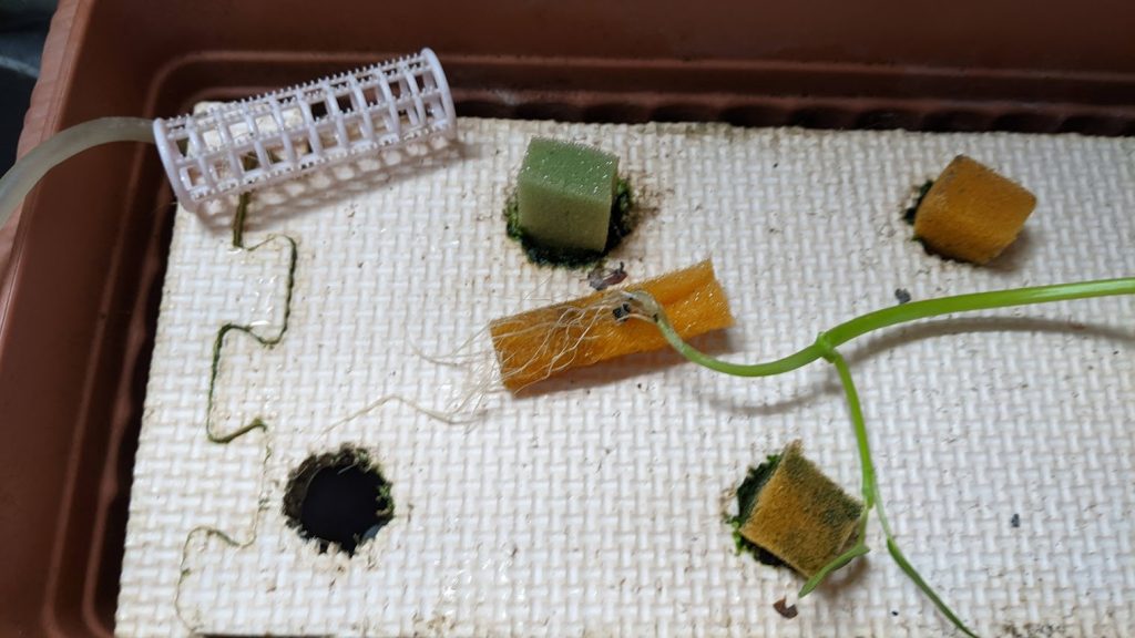 水槽に液肥をいれました。その水槽にカップを乗せて完成です。