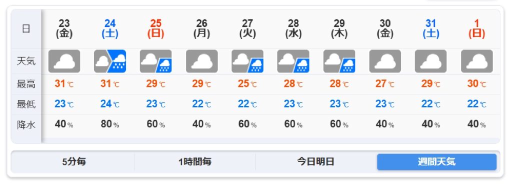 暑さが和らいでいるようです。お天道様が出てこないですね。お日様マークが全くない!