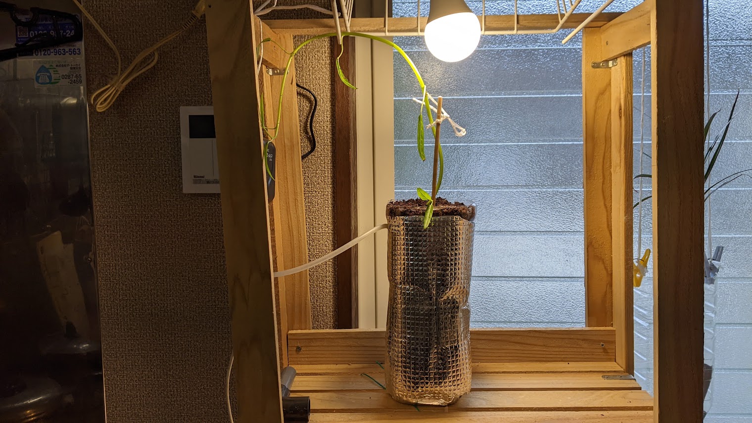 ペットボトルの水耕栽培で、空心菜を栽培している写真です。