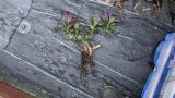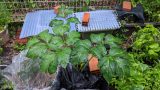 自家製の培養土で、不織布バッグで栽培しています。大きく育っていまして、支柱に結び付けるのを怠っていたら…。