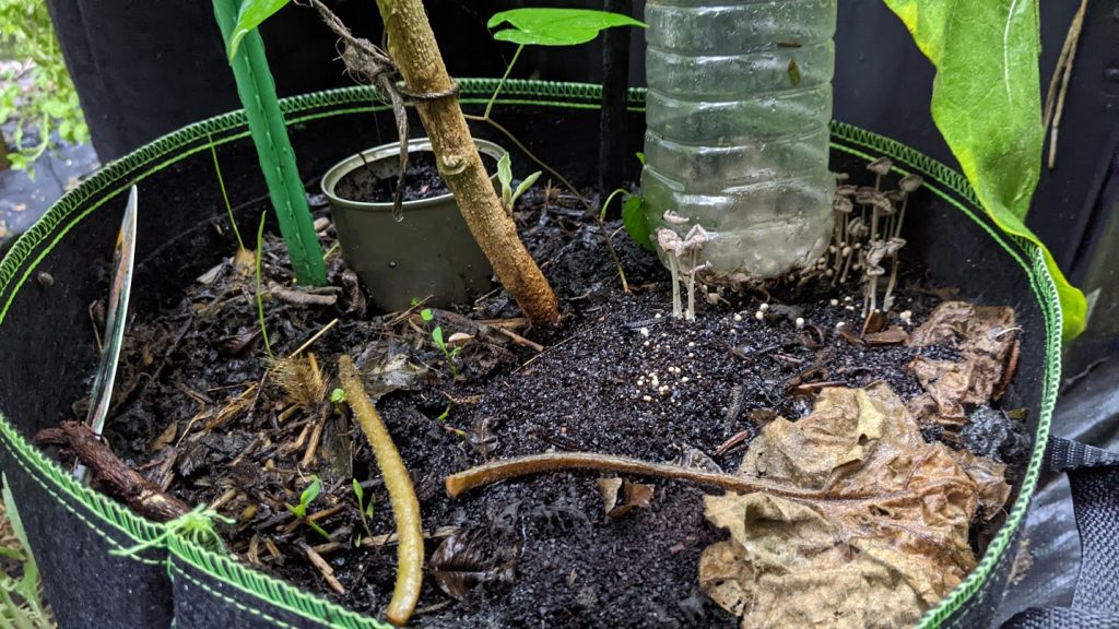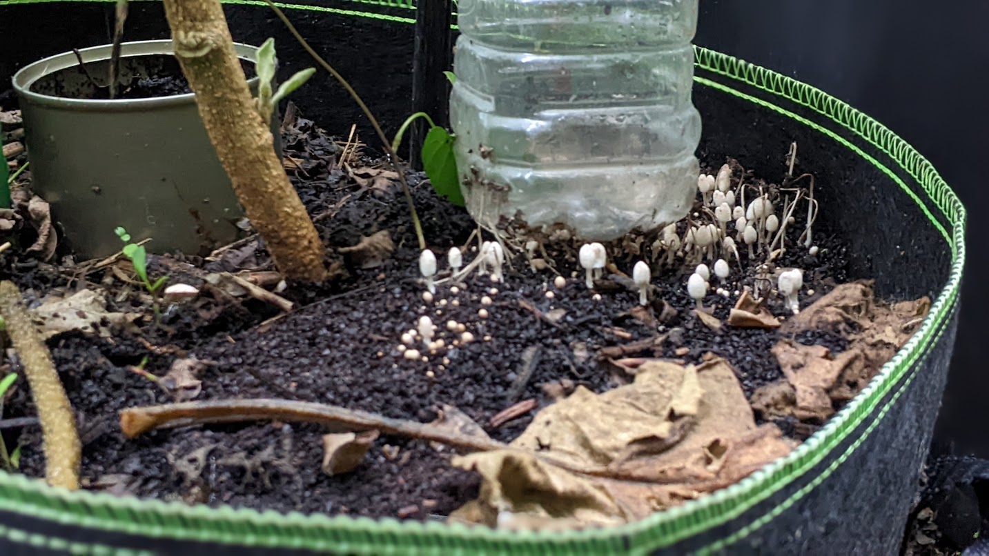 朝6時、ペットボトルの前にキノコが生えています。