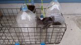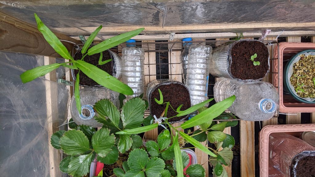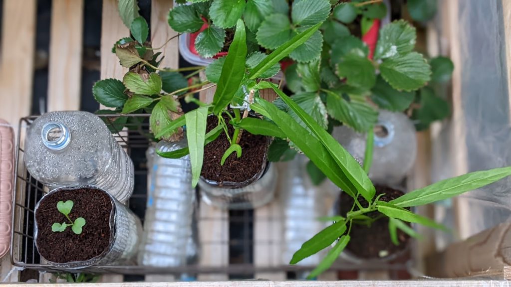 ペットボトルの水耕栽培をしています。ペットボトルを加工して液肥を入れて、苗を植えています。