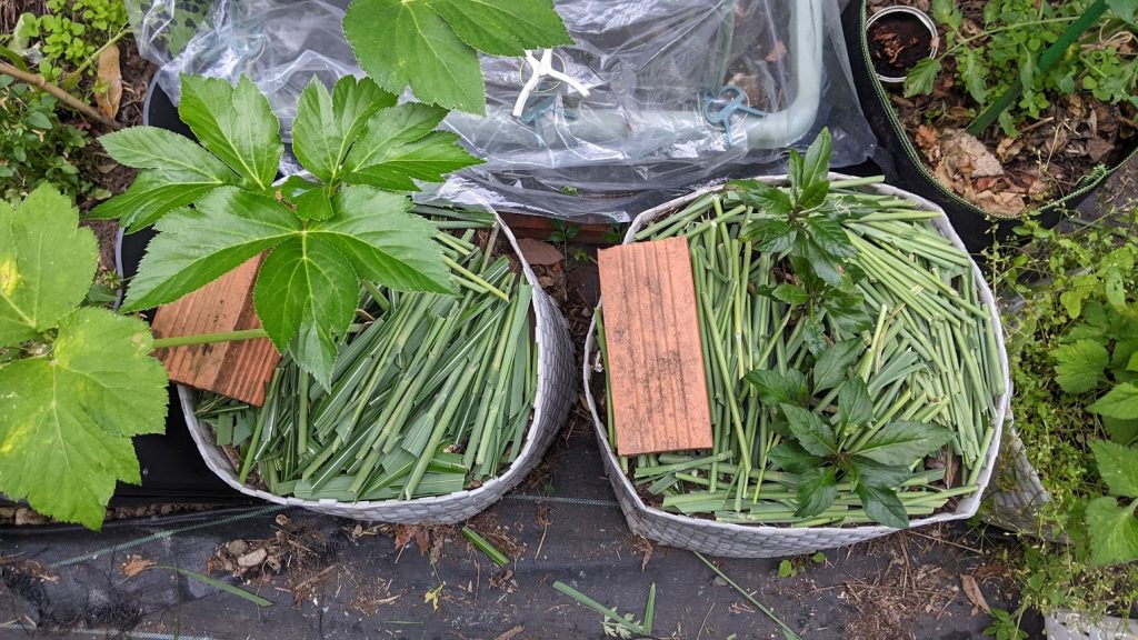 このカゴの培養土は、高炭素率の高い有機物だけ意図して入れています。米ぬか、生ごみは入れていません。通常であれば、窒素飢餓を起こして、黄色い葉のか細い明日葉になります。菌根菌と結びつけば、ご覧の通りの逞しさです。こうなると、水やりだけで、勢いが衰えません。