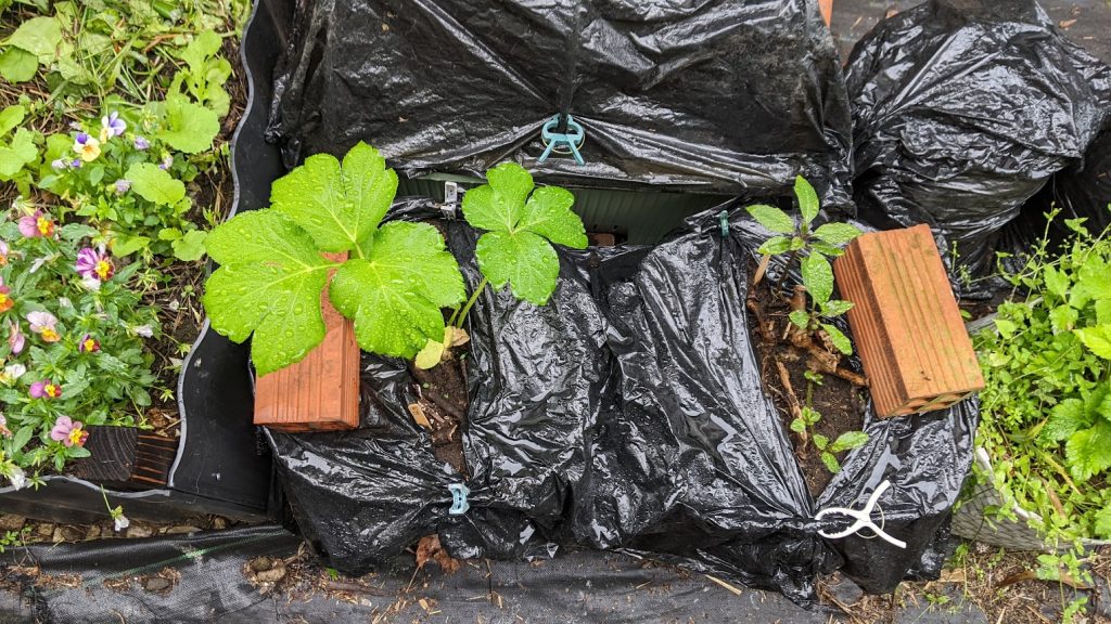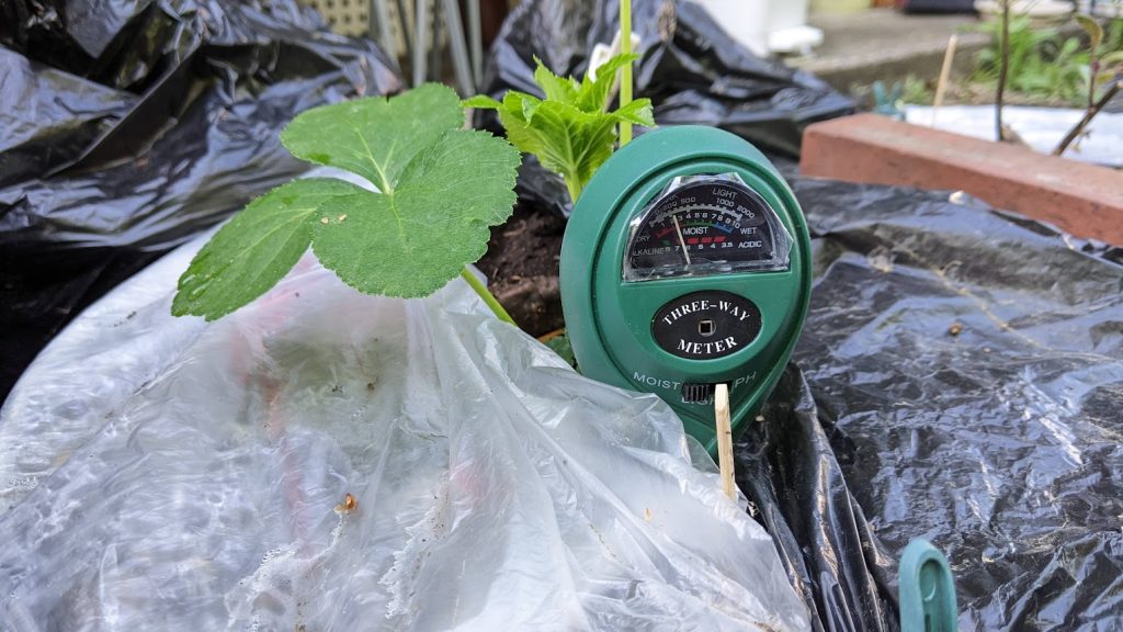 一枚目の写真は5月2日、苗を買ってきて植えたころです。二枚目は湿度を測っています。株もとに雨除け兼土壌菌の保護のマルチをしているので、目測で湿気がわかりません。水をやるかどうかは、湿度計を差し込んで計測してから決めます。三枚目は、マルチしている様子です。