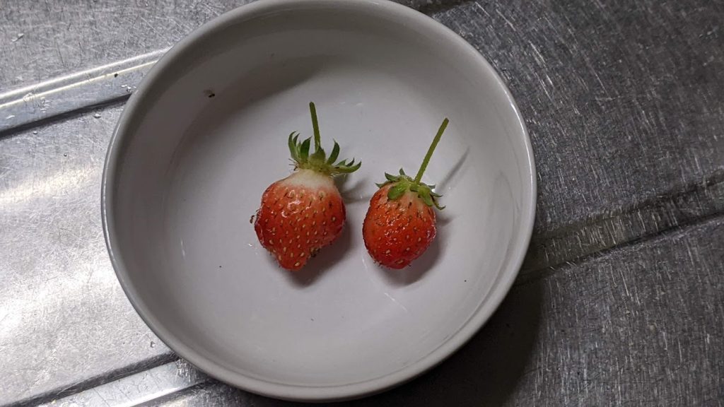 外でイチゴが生っていました。春は酸っぱいイチゴでしたが、なぜか今は甘いです。