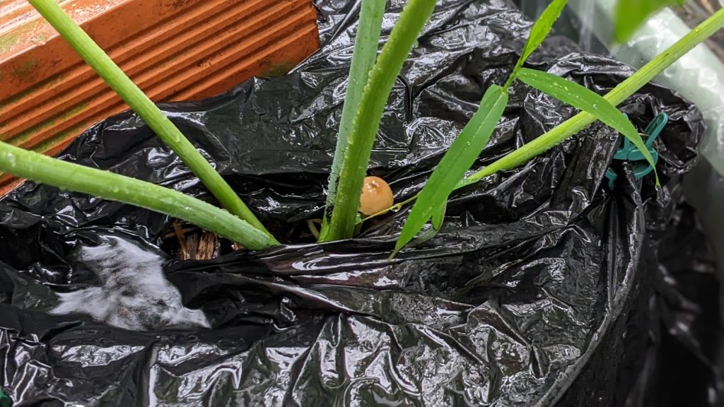 一枚目の写真は、株もとにキノコが生えました。糸状菌を増やしているので、糸状菌の一種のキノコは歓迎です。二枚目はマルチを剥がした写真です。枯れ木に糸状菌がついています。三枚目は、カヤを切ってきて、株もとに敷き詰めました。株もとの直射日光の保護と、糸状菌の餌になります。