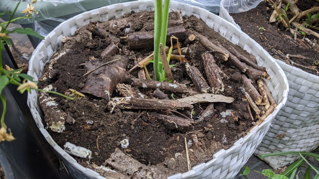 土と枯れ木、落ち葉、カヤを入れたカゴで、明日葉を栽培しています。吉田先生の菌ちゃん栽培です。