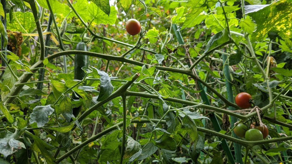 4月末に苗で植えて、5月6月はあんまり大きくならなくて、失敗したのかと思いました。いきなり実が付いて大きくなり、毎日なるようになりました。トマトと同じ林の土で、レイズドベッドの隣同士で栽培しています。どちらも枝が長く伸びて、競争するように茂っています。